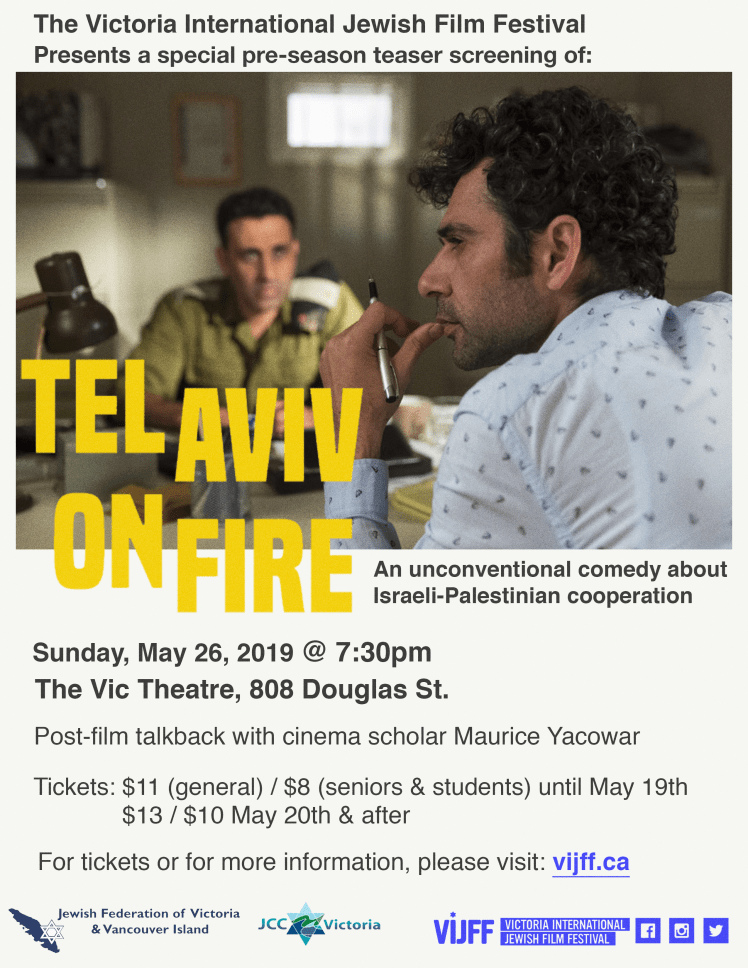 VIJFF Special Event – ‘Tel Aviv On Fire’ Screening on Sunday, May 26th Posted on May 11, 2019May 11, 2019 by larrygontovnick VIJFF (VIJFF.CA) is a project of the Jewish Community Centre of Victoria.