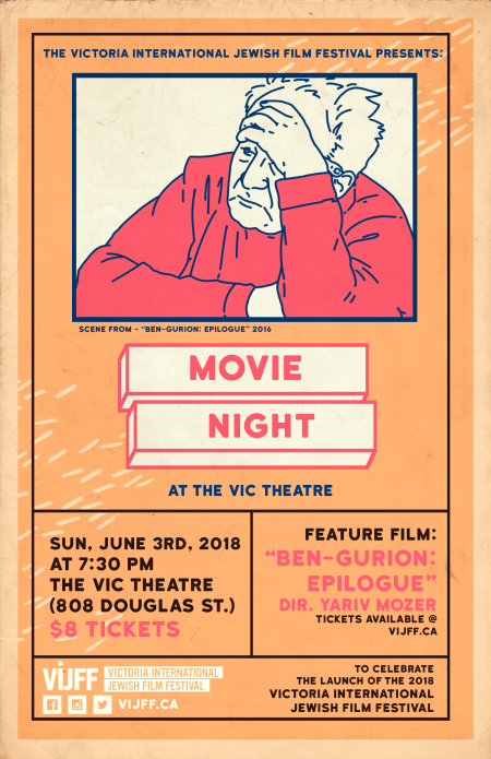The June 3rd screening is a special event that will serve as a pre-launch for the fourth Victoria International Jewish Film Festival, which will take place November 3-6, 2018, at the Vic Theatre, 808 Douglas St., in Victoria.